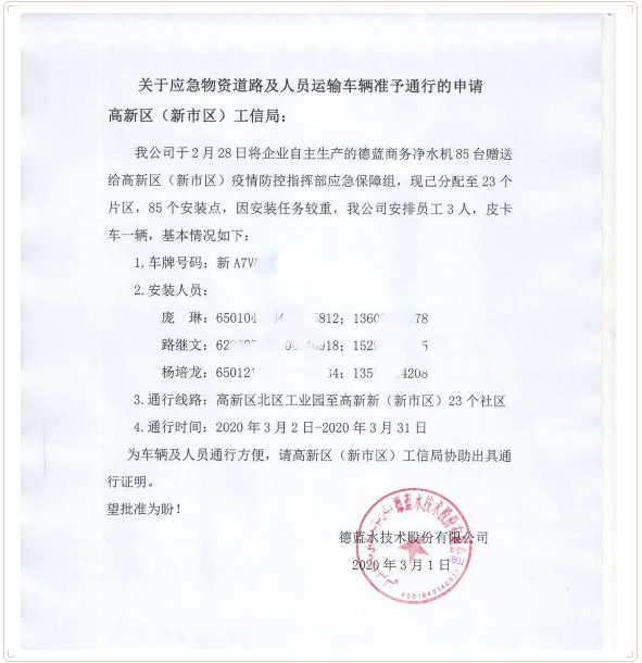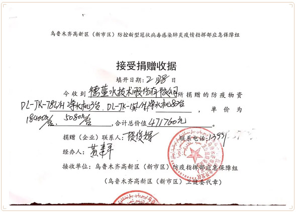 2020年2月28日,德藍水技術(shù)股份有限公司向烏魯木齊市高新區(qū)(新市區(qū))新型冠狀病毒感染的肺炎疫情防控指揮部捐贈健康水直飲水機85臺,慰問品一批,價值47萬余元,用于疫情防疫工作。近日,高新區(qū)防疫指揮部特發(fā)來感謝函,感謝德藍的捐贈。