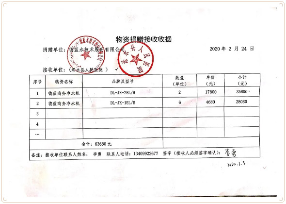 3月3日湖北浠水縣人民醫(yī)院發(fā)來感謝信,感謝徳藍(lán)在危難時(shí)刻捐贈(zèng)的健康水直飲水機(jī)。