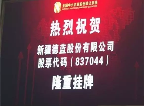 2016年5月27日,新疆德藍股份有限公司(證券簡稱:德藍股份,證券代碼:837044)在全國中小企業(yè)股份轉(zhuǎn)讓系統(tǒng)舉辦了新三板掛牌上市敲鐘儀式。 烏魯木齊市高新技術(shù)產(chǎn)業(yè)開發(fā)區(qū)(新市區(qū))區(qū)委副書記、區(qū)人大常委會黨組書記李潮云,烏魯木齊高新投資發(fā)展集團有限公司黨委書記、董事長黃煌出席了掛牌儀式,德藍股份董事長曾凡付先生攜公司高管、合作伙伴、中介服務(wù)機構(gòu)代表等共同出席掛牌儀式,見證了德藍股份這一重要歷史時刻。