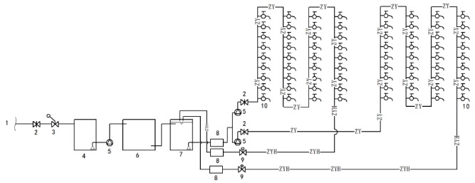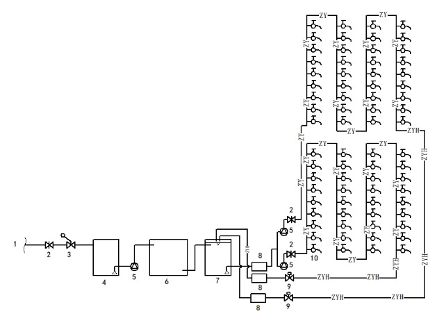 1—城鎮(zhèn)供水 2—閘閥 3—遙控浮球閥 4—原水箱 5—加壓泵 6—水處理設備 7—凈水箱(消毒) 8—紫外循環(huán)組件 9—循環(huán)電動控制閥區(qū) 10—水嘴(終端飲水裝置)
