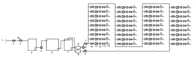 1—城鎮(zhèn)供水 2—閘閥 3—遙控浮球閥 4—原水箱 5—加壓泵 6—水處理設備 7—凈水箱(消毒) 8—紫外循環(huán)組件 9—循環(huán)電控制動閥 10—加密表前閥 11—支管減壓閥 12—直飲水水表 13—表后閥 14—水嘴(終端飲水裝置)