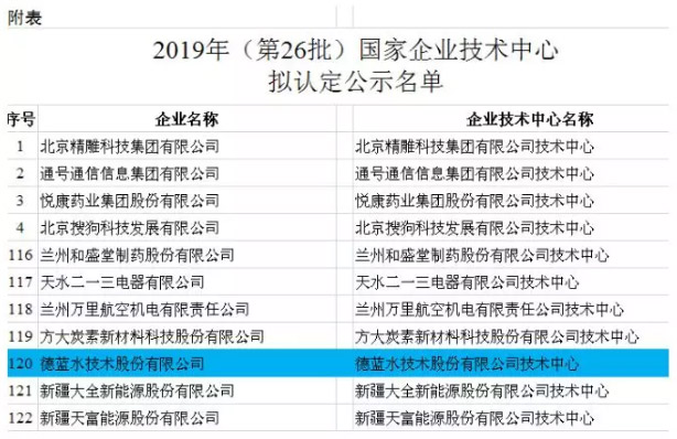 此次評選經(jīng)過形式審查、會議評審、認(rèn)定復(fù)核和網(wǎng)上公示,共有122家通過認(rèn)定。德藍(lán)水技術(shù)股份有限公司國家企業(yè)技術(shù)中心是2019年(第26批)新疆區(qū)唯一通過認(rèn)定的單位。