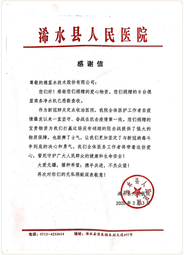 3月3日湖北浠水縣人民醫(yī)院發(fā)來感謝信,感謝徳藍(lán)在危難時(shí)刻捐贈(zèng)的健康水直飲水機(jī)。