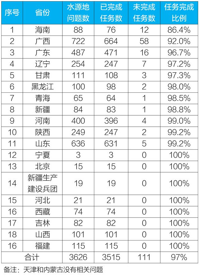 一大批問題得到解決 根據(jù)安排,今年年底前,20個(gè)省份(長江經(jīng)濟(jì)帶以外的)及新疆生產(chǎn)建設(shè)兵團(tuán)的156個(gè)地市899個(gè)縣級水源地需要完成整治工作,涉及3626個(gè)問題,任務(wù)十分艱巨。 截至10月13日,已完成整治的問題數(shù)量為3515個(gè),完成比例達(dá)到97%,余下的111個(gè)問題也在持續(xù)推進(jìn)整改。與生態(tài)環(huán)境部8月份通報(bào)的情況相比,在近兩個(gè)月的時(shí)間里,完成整治的問題個(gè)數(shù)增加了529個(gè),完成率從82.3%提高到97%。 從省份看,目前,北京、河北、山西、吉林、福建、西藏、寧夏和新疆生產(chǎn)建設(shè)兵團(tuán)等8個(gè)省份已經(jīng)完成今年水源地整治任務(wù)。 山東、陜西、河南、新疆、青海、黑龍江、甘肅、遼寧、廣東、廣西等10個(gè)省份整治進(jìn)度超過90%,海南整治進(jìn)度為86%,也超過了序時(shí)進(jìn)度要求。 從地市看,在今年涉及的156個(gè)地市中,已有116個(gè)地市完成水源地整治任務(wù),占城市總數(shù)的70%以上。 通過水源地整治工作,一大批影響水源地的環(huán)境問題得到解決,許多水源地重大風(fēng)險(xiǎn)隱患得以消除,飲用水水源地風(fēng)險(xiǎn)防控能力明顯增強(qiáng),得到老百姓的真心擁護(hù)。 各地拿出硬措施,真抓真治 成績來之不易,離不開各級黨委政府和社會(huì)各界高度重視,協(xié)力推進(jìn)。 北京、河北、山西、吉林、福建、西藏、新疆等黨委政府高度重視,負(fù)責(zé)同志赴現(xiàn)場調(diào)研指導(dǎo),協(xié)調(diào)解決難點(diǎn)問題。各相關(guān)部門加強(qiáng)協(xié)作,組織召開現(xiàn)場會(huì),細(xì)化完善整改方案,延續(xù)“精準(zhǔn)調(diào)度,逐一銷號”機(jī)制,倒排工期,持續(xù)發(fā)力,推動(dòng)水源地環(huán)境問題整改。 廣西壯族自治區(qū)有722個(gè)問題,數(shù)量最多,任務(wù)重、壓力大。自治區(qū)黨委政府定期聽取工作匯報(bào),分管負(fù)責(zé)同志一線調(diào)度、一線檢查、一線解決問題,現(xiàn)場指導(dǎo)督辦問題整改。目前,722個(gè)問題中已完成整治的有664個(gè),完成率達(dá)到92%,超過序時(shí)進(jìn)度要求。 廣東省水源地整治任務(wù)較重,省委省政府定期研究生態(tài)環(huán)境保護(hù)問題,每月通過省政府工作信息對各地整治情況進(jìn)行通報(bào),對達(dá)不到要求的實(shí)施約談。相關(guān)部門建立了部門協(xié)作、多層次會(huì)商、問題響應(yīng)協(xié)調(diào)等工作機(jī)制,通過取締搬遷、工程建設(shè)、水源地遷建調(diào)整等多種措施,對不同類型水源地環(huán)境問題開展精準(zhǔn)整治,解決了一大批水源地安全隱患。 攻堅(jiān)克難,離不開各地真抓實(shí)干,勇于創(chuàng)新?!坝械氖》菀恢闭{(diào)度到區(qū)縣的工作情況,對涉及老百姓飲水安全的問題非常關(guān)注,對一些工作難點(diǎn)了解的很細(xì),工作抓得實(shí)?!鄙鷳B(tài)環(huán)境部有關(guān)負(fù)責(zé)同志說。 余下的“硬骨頭”仍需大力整治 在充分肯定工作成效的同時(shí),生態(tài)環(huán)境部有關(guān)負(fù)責(zé)同志與地方深入交流中也指出,剩余問題很多是“硬骨頭”,不可掉以輕心,要具體分析、精準(zhǔn)施策。 按照最新調(diào)度情況,在未完成任務(wù)的40個(gè)地市中,廣西壯族自治區(qū)玉林市、河池市,遼寧省錦州市未完成整治的問題數(shù)相對較多,分別有17個(gè)、10個(gè)和7個(gè)。一些問題涉及取水口變更和規(guī)范建設(shè),工程量大;一些涉及農(nóng)村污水收集整治及運(yùn)作維護(hù),情況復(fù)雜等,都需要具體問題具體分析。 生態(tài)環(huán)境部有關(guān)負(fù)責(zé)同志表示,打好水源地保護(hù)攻堅(jiān)戰(zhàn)是中央作出的重要決策部署,是關(guān)乎民生的政治問題,請各省廳和地市繼續(xù)盯緊落實(shí),對涉及到取水口變更及保護(hù)區(qū)劃定的,省級環(huán)保部門要提前介入指導(dǎo),加強(qiáng)協(xié)調(diào),依法依規(guī)推進(jìn);對涉及工程施工問題的,在堅(jiān)持“質(zhì)量優(yōu)先、安全生產(chǎn)”前提下,進(jìn)一步把工作做實(shí)做細(xì),優(yōu)化方案,分段施工,確保實(shí)效。如果有出現(xiàn)因特殊天氣影響施工進(jìn)度等客觀情況的,大家及時(shí)溝通,一起想辦法,實(shí)事求是推進(jìn)整治工作。 生態(tài)環(huán)境部表示,將進(jìn)一步加強(qiáng)溝通協(xié)調(diào),為各地做好服務(wù)保障工作。近期由司局長帶隊(duì),組織包保協(xié)調(diào)組赴現(xiàn)場開展調(diào)研幫扶,幫助地方一起做好工作,協(xié)調(diào)解決實(shí)際問題,讓人民群眾享有更多生態(tài)環(huán)境上的幸福感和獲得感。